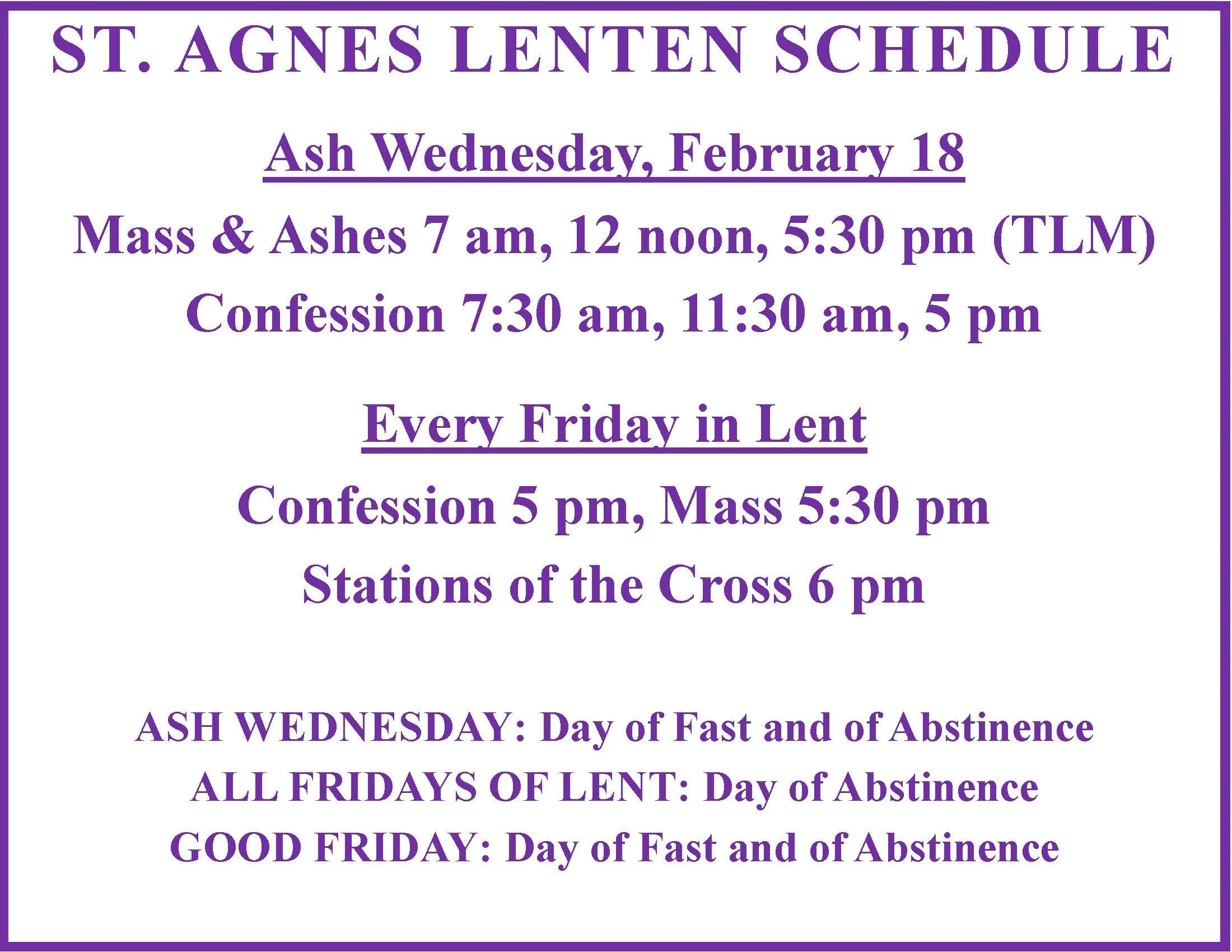 St. Agnes Schedule for Ash Wednesday and Lent Jan 31 Written By St. Agnes Catholic Church - Baton Rouge Photo by Kamil Szumotalski on Unsplash St. Agnes Catholic Church - Baton Rouge